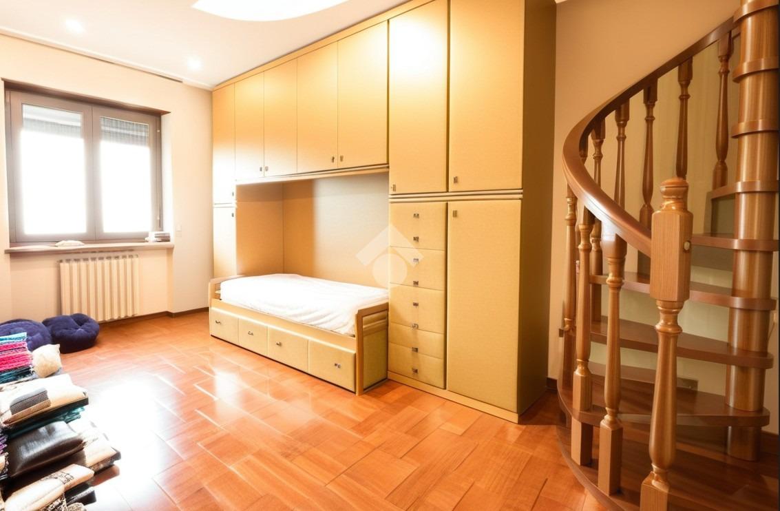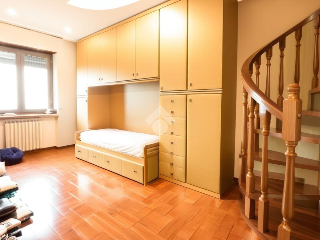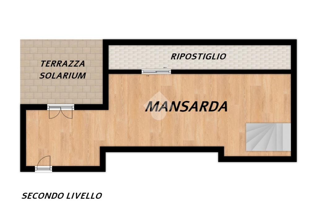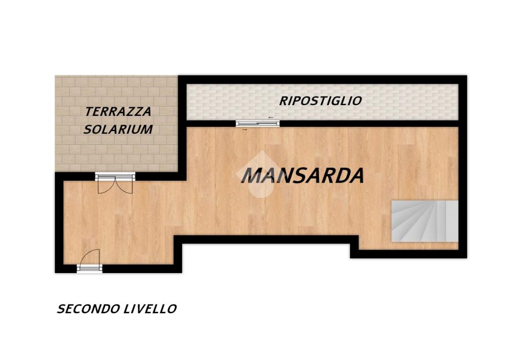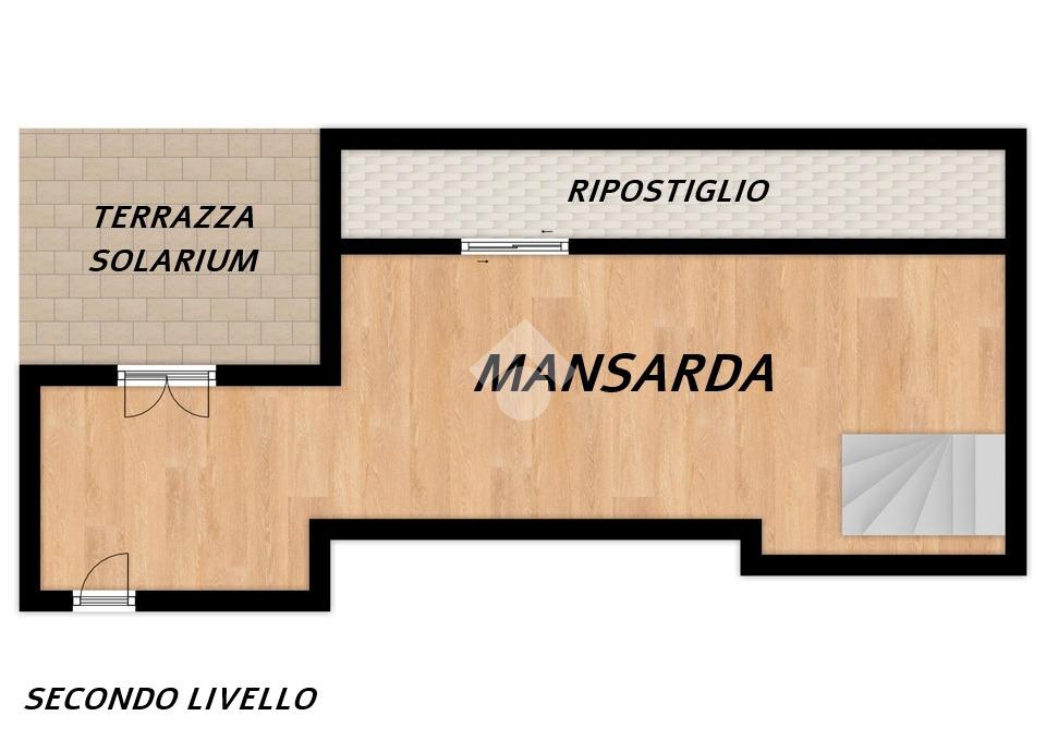 Tramite una scala in legno si accede al piano superiore la cui destinazione può essere multifunzionale in base alle esigenze dell'acquirente e sfruttando bene il tetto spiovente con arredi su misura: camera matrimoniale, studio, spazio relax, area hobby. La particolarità di questo piano è un secondo accesso indipendente dal vano scala condominiale ottimo per chi, ad esempio, ha la necessità di creare uno studio professionale.