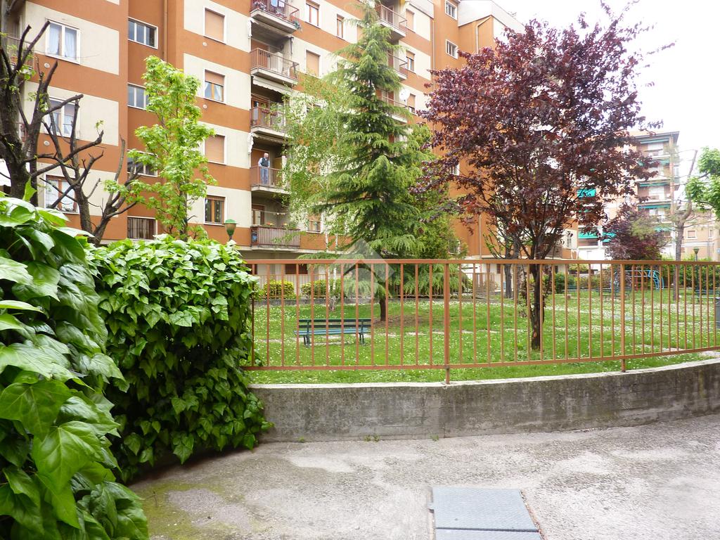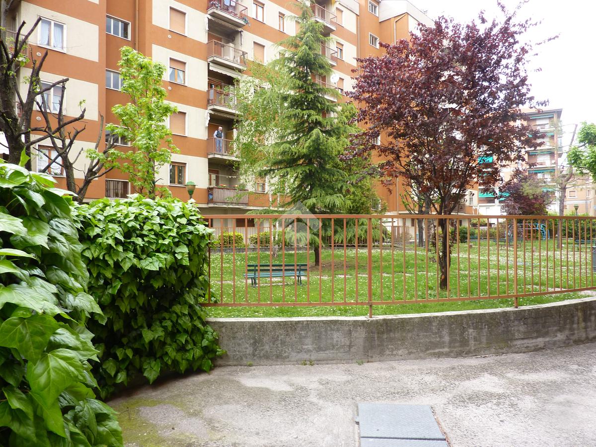 Presente un giardino condominiale recintato e regolamentato a disposizione di tutti i condomini con piante verdi e alberi.